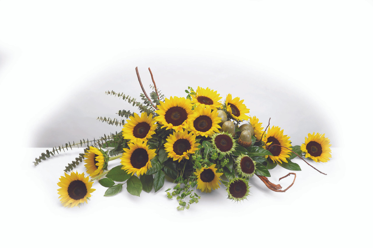 AN EXPRESSION OF TRUE LOVE, BEAUTIFUL DELUXE SUNFLOWERS AND TROPICAL GREENS.